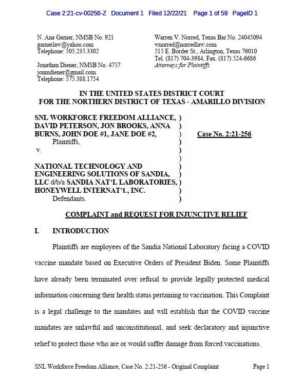 This suit takes a bit different approach than others and also has learned from other suits. It distinguishes this case from the now-infamous Jacobson v. Massachusetts case (1905 small pox case involving an actual law passed by a state that included exemptions, reasonable fines, and a proven vaccine), employs Ninth Amendment reasoning in a due process claim, and reasons that Honeywell and other similar contractors have constitutional obligations even though they are private companies.