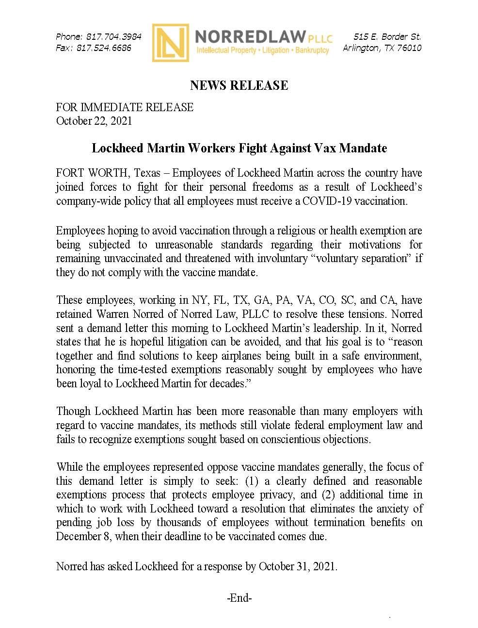 These employees, working in NY, FL, TX, GA, PA, VA, CO, SC, and CA, have retained Warren Norred of Norred Law, PLLC to resolve these tensions. Norred sent a demand letter this morning to Lockheed Martin’s leadership. In it, Norred states that he is hopeful litigation can be avoided, and that his goal is to “reason together and find solutions to keep airplanes being built in a safe environment, honoring the time-tested exemptions reasonably sought by employees who have been loyal to Lockheed Martin for decades.”